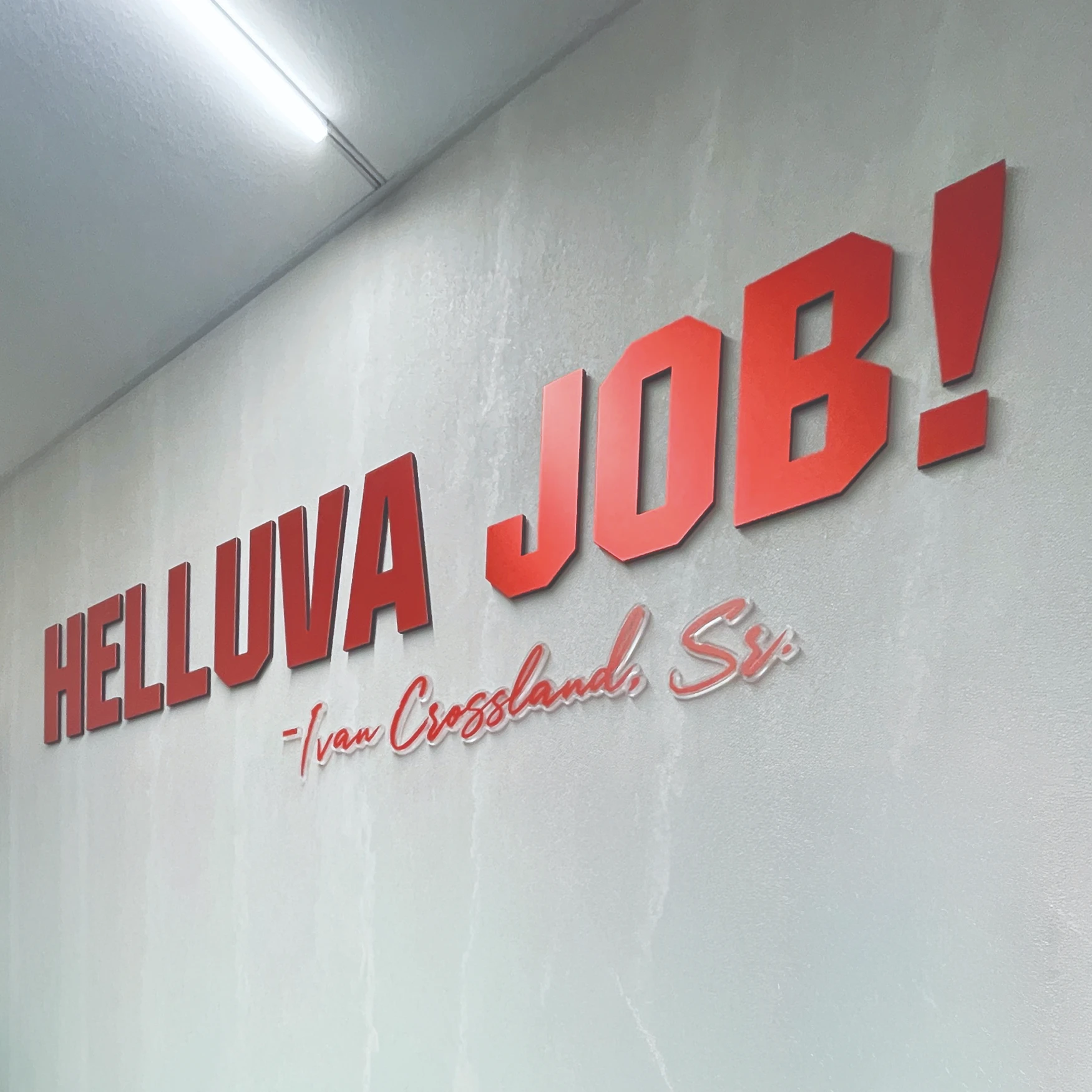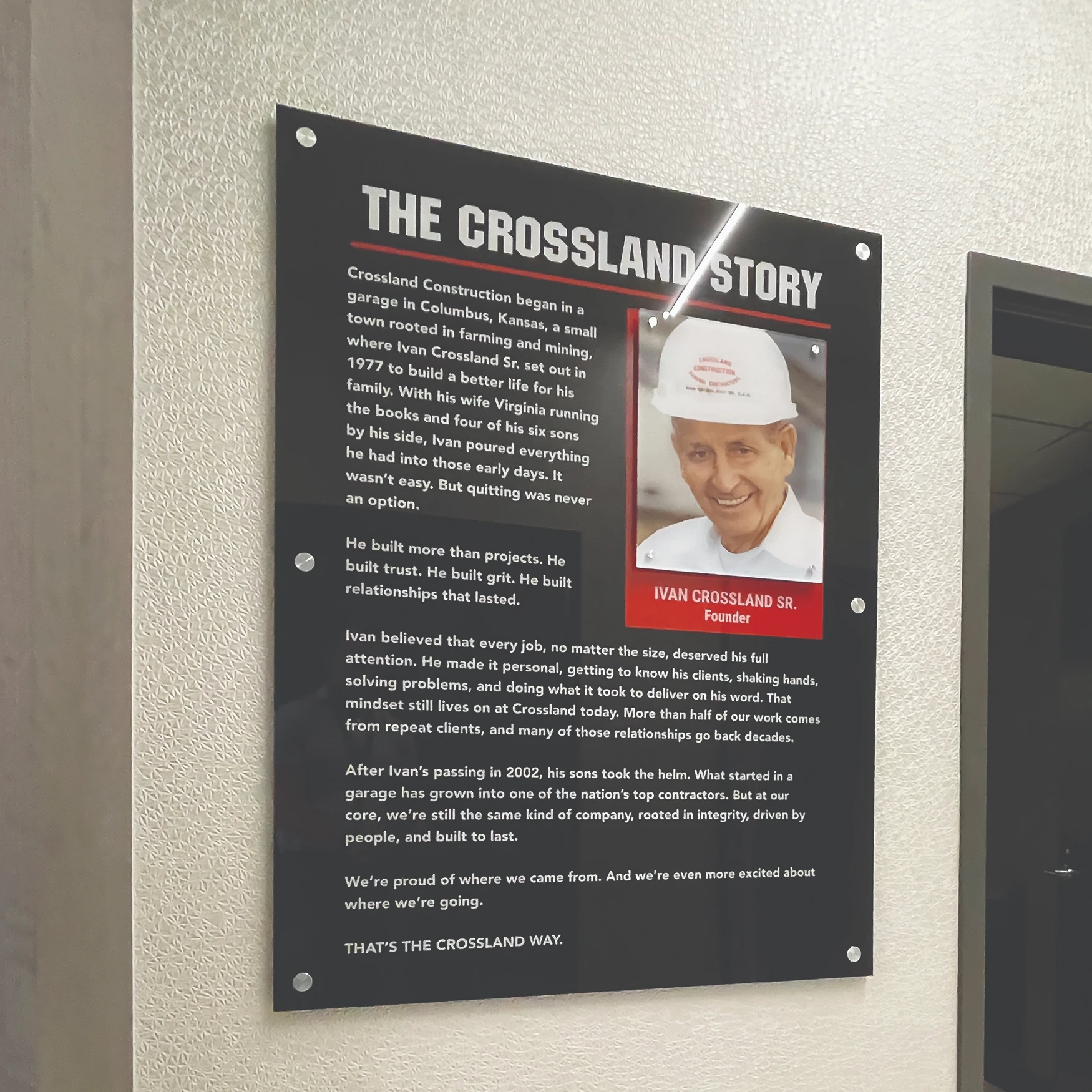 The installation features dimensional brushed aluminum lettering, custom-painted to precisely match Crossland Construction’s brand colors, along with a matching metal logo sign that serves as a strong visual focal point. In addition, we produced a custom acrylic story sign that highlights the company’s history and values, adding depth and narrative to the space.