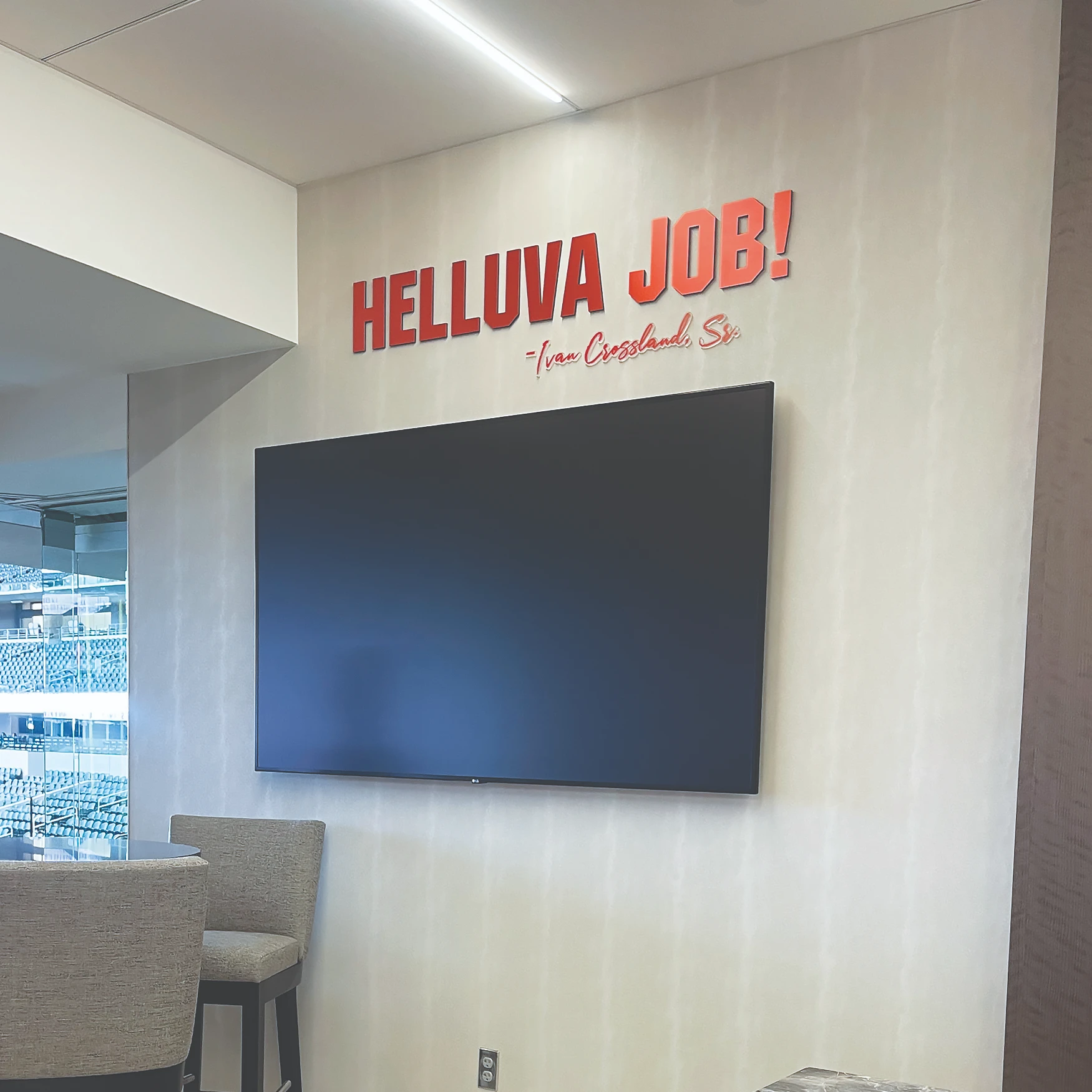 Artworks Commercial Graphics, Inc. designed, fabricated, and installed a suite of custom interior signage for Crossland Construction at AT&T Stadium. This project focused on creating a refined, professional environment that reflects the client’s brand and story within their private suite space.