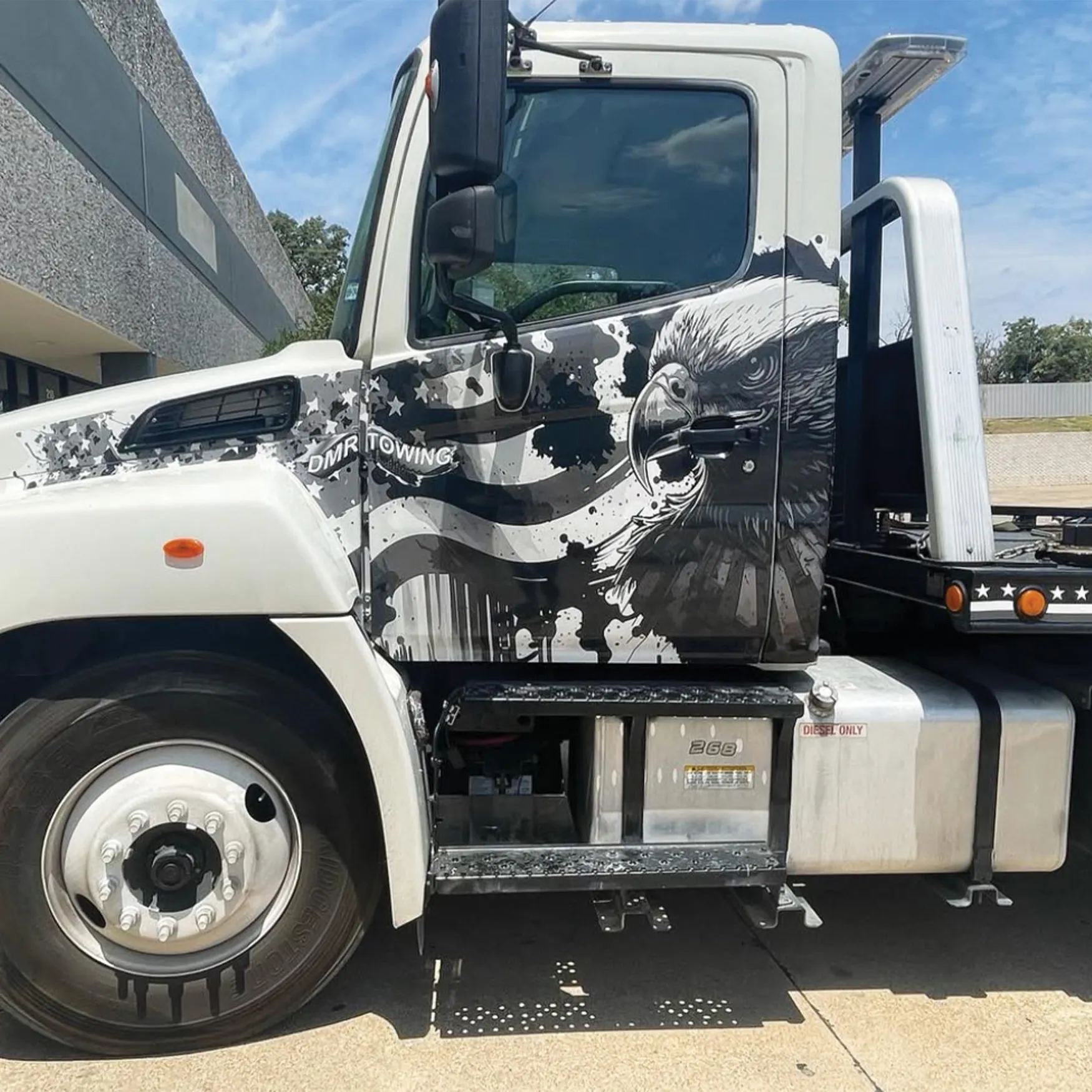 Artworks Commercial Graphics, Inc. collaborated with DMR Towing to create a patriotic-themed vehicle wrap that reflects the client’s vision and pride. The design features a bold eagle motif combined with the American flag, blending seamlessly across the vehicle’s contours for maximum visual impact.