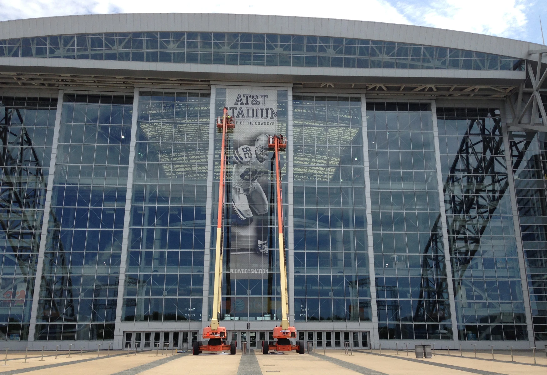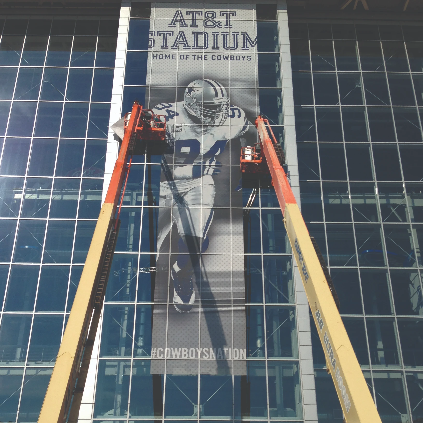 Artworks Commercial Graphics, Inc. printed and installed large-scale exterior window graphics for both the East and West End Zones at AT&T Stadium. This high-profile project required precision production and expert installation at extreme heights, reaching nearly 150 feet above ground level.